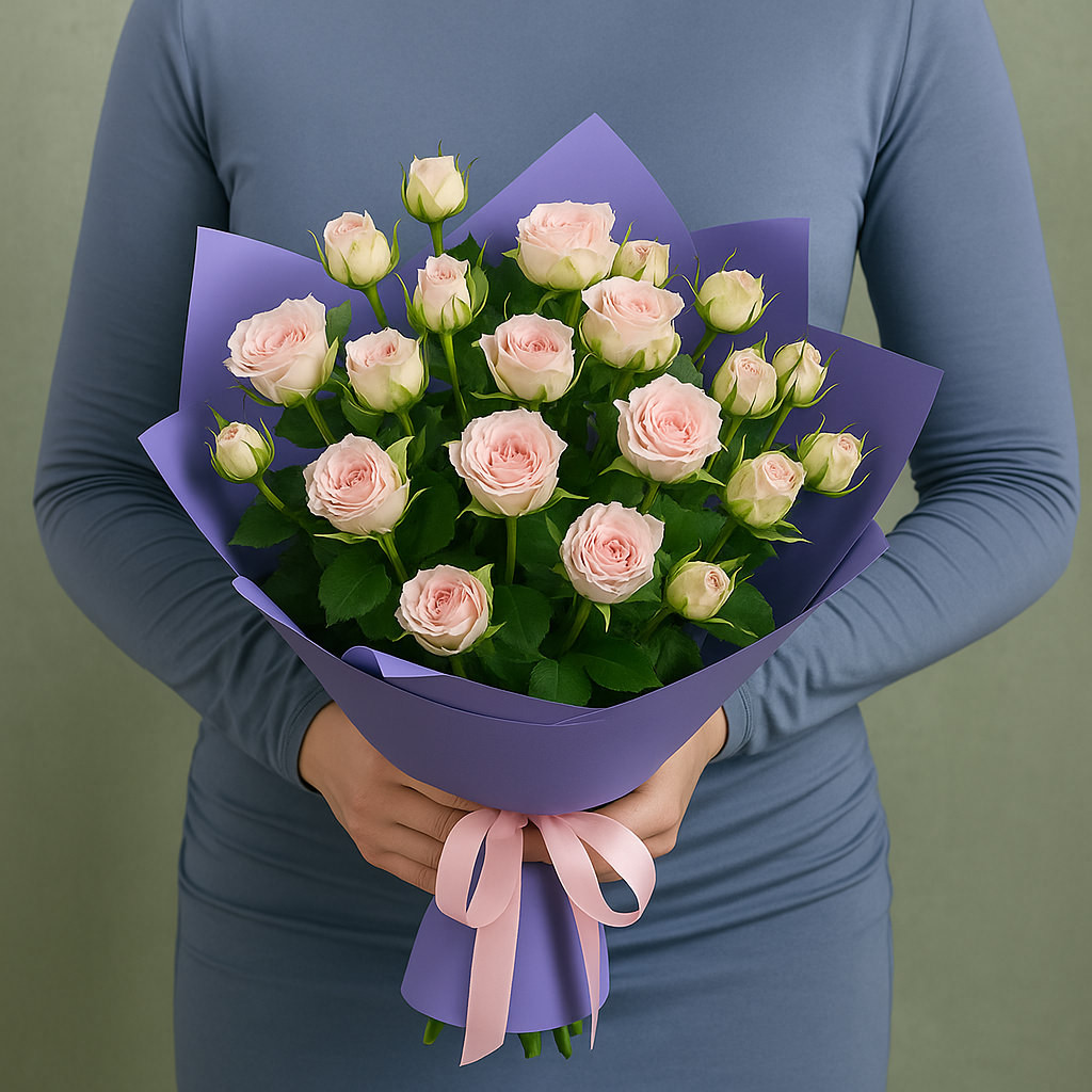 Очаровательный букет из нежных розовых кустовых роз в лавандовой упаковке с розовой лентой — символ утончённости и искренней заботы. Идеальный подарок, чтобы выразить внимание и трепетные чувства.